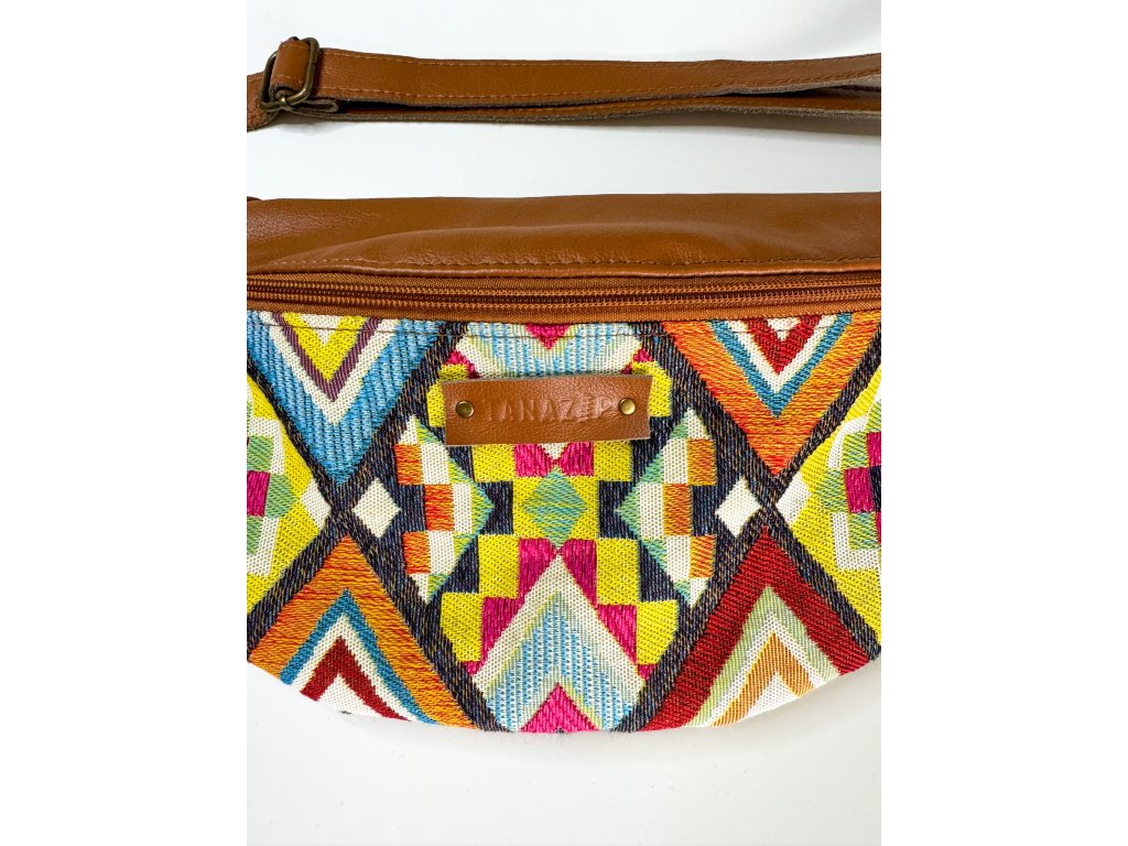 Ledvinka Geometria vyniká praktickým designem a pečlivým zpracováním. Tento kousek je ušitý z koňakové hovězí kůže a krásného gobelínu, se vzorem etno - mexický vzor, který je také v podšívce. Popruh je také z koňakové hovězí kůže.